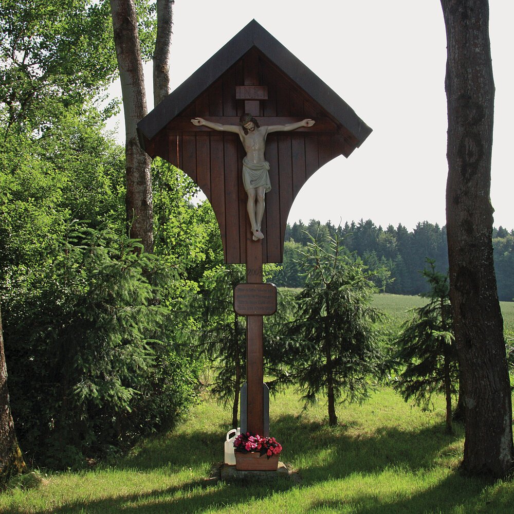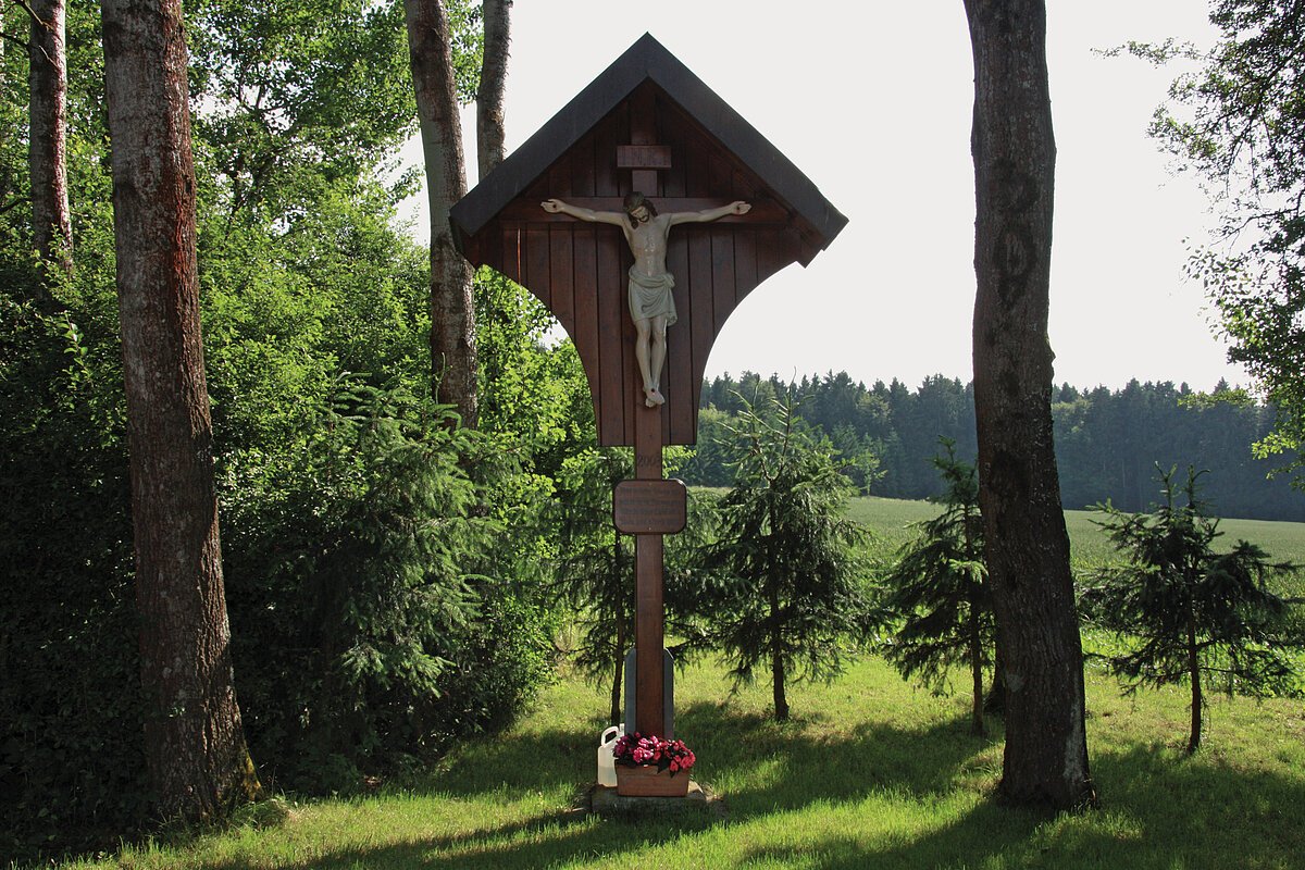 Arnbuch liegt in einem naturgegebenen Kessel. Ein markantes Flurkreuz lädt auf dem Radwanderweg nach Altmannstein zum Verweilen ein.