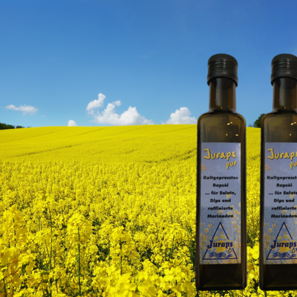 Verkauf von JURAPS: Kalt gepresstes Rapsöl aus der Region auch als Kräuteröl in der Schmuckflasche