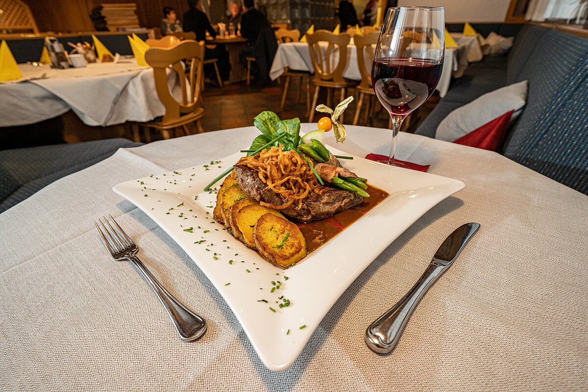 Zwiebelrostbraten mit Kartoffel Wedges, Bohnen im Speckmantel und gem. Salat