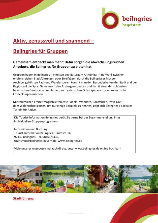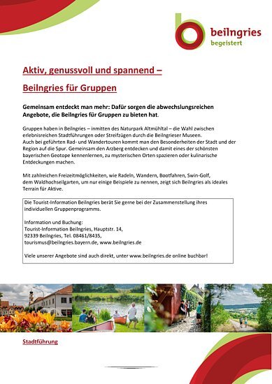 Die Vielfalt der Aktivitäten in und um Beilngries ist groß. Auf ihre Gruppe zugeschnitten bieten unsere Gästeführer ein breites Spektrum an Führungen an, welche Sie direkt online bei uns buchen können.