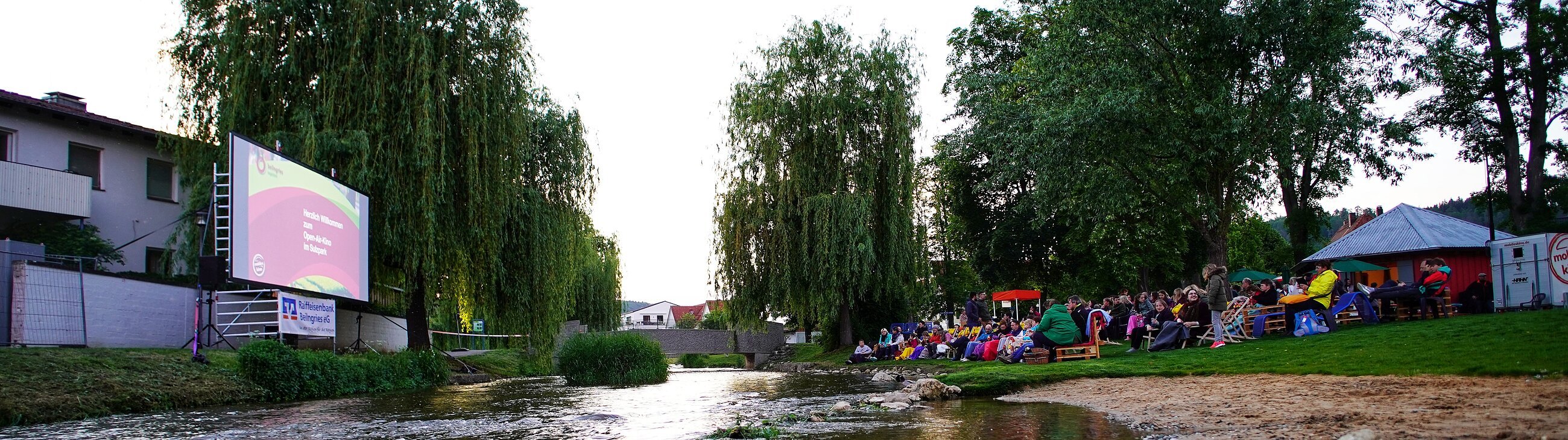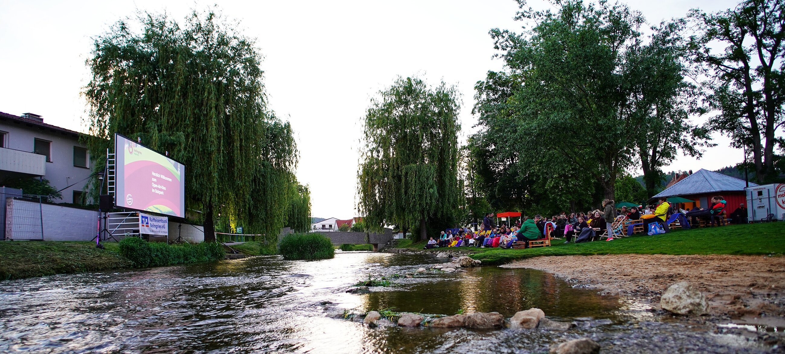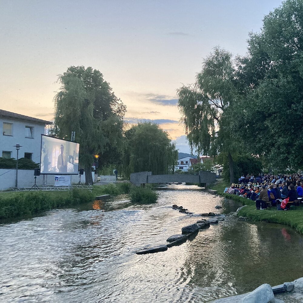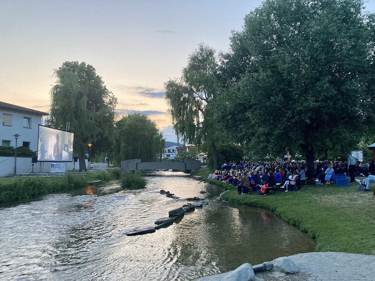 Mit Blick auf die Leinwand auf der einen Seite und dem sanft fließenden Sulzbach auf der anderen genossen die Besucherinnen und Besucher das ganz besondere Freiluft-Kinoerlebnis. Ob mitgebrachte Picknickdecke oder bereitgestellter Sitzplatz – für eine entspannte Atmosphäre war bestens gesorgt.
