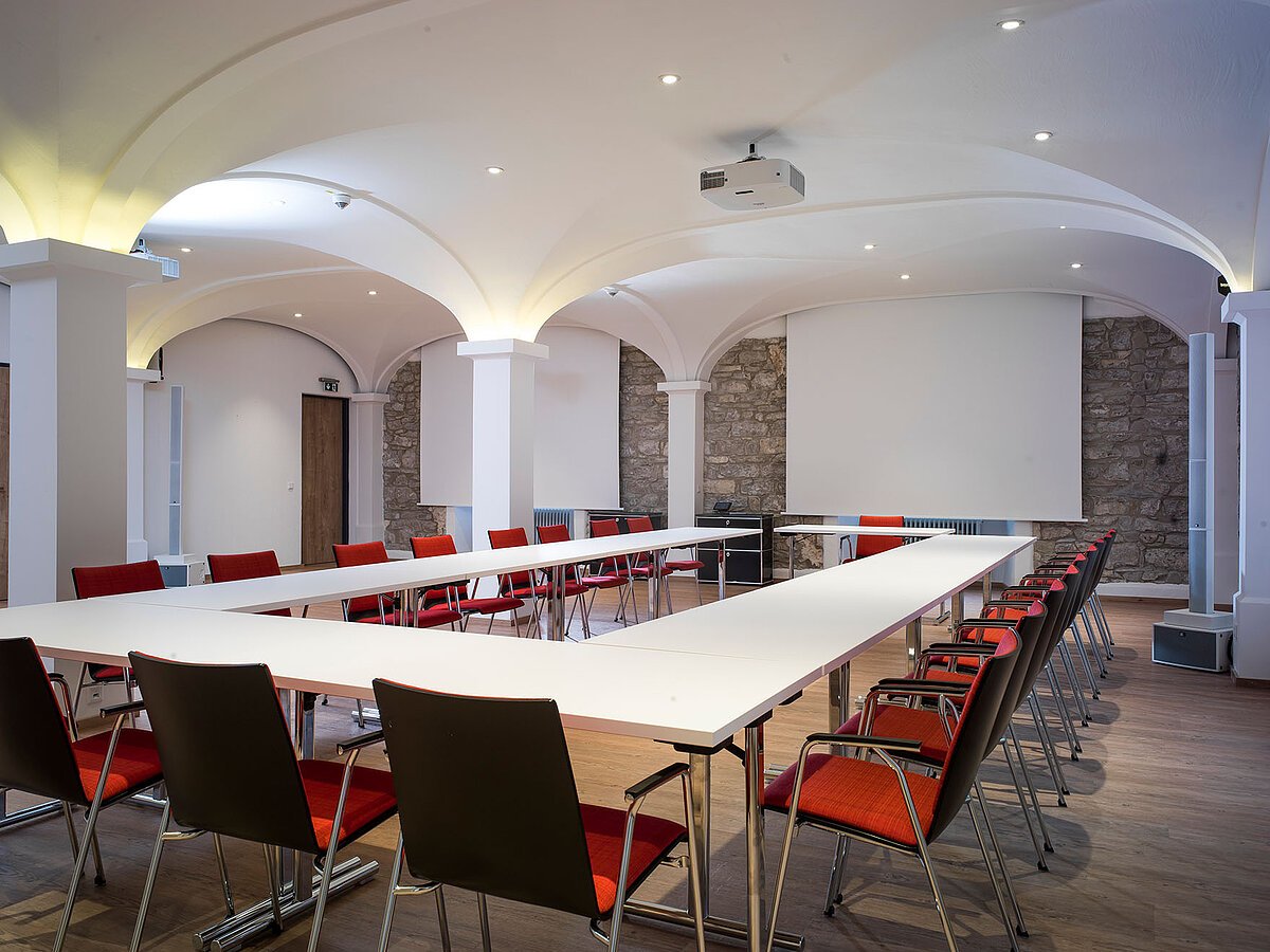 Das Haus bietet im ersten Stock einen wunderschönen Sitzungssaal mit Deckengewölbe und freigelegten Außenmauern. Dieser Saal ist durch eine Wand teilbar, sodass auch zwei kleinere Räume für Arbeitskreise genutzt werden können.