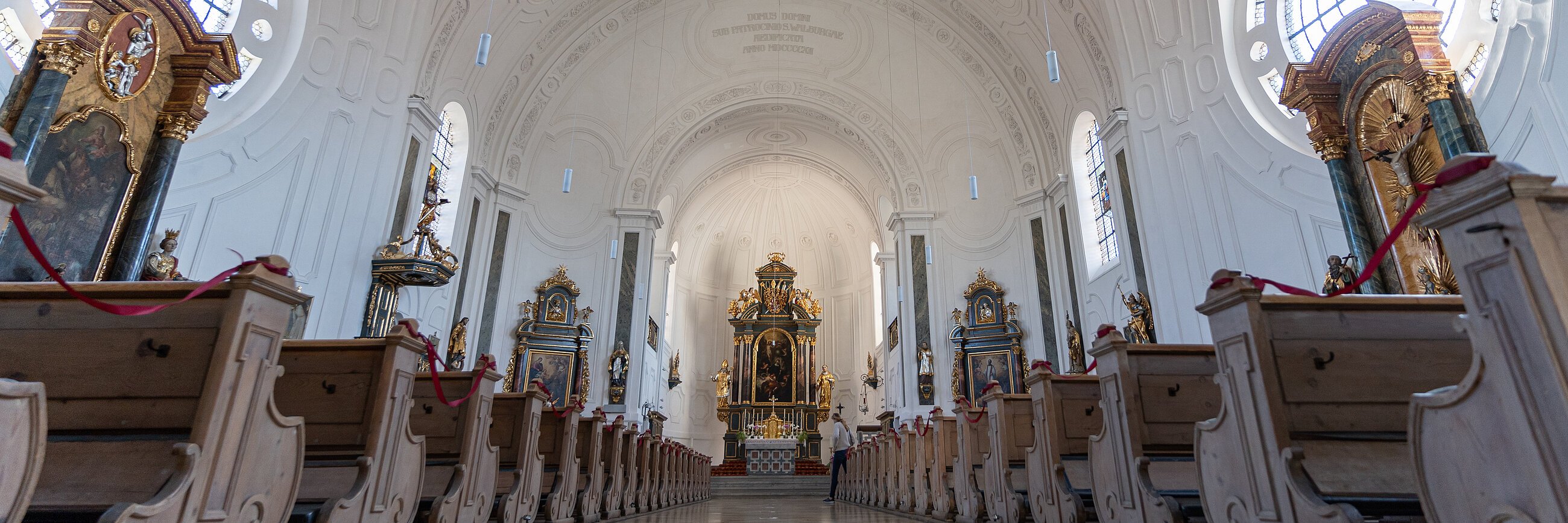 In den 1912/13 errichteten neubarocken Bau übernahm man aus dem Vorgängerbau den Hochaltar und die beiden vorderen Seitenaltäre. Den stattlichen, wohlproportionierten Hochaltar stiftete auf Grund eines Gelübdes 1695 der Eichstätter Fürstbischof Johann Euchar Schenk von Castell; sein geschnitztes Wappen befindet sich über dem Altarblatt, das die Kirchenpatronin St. Walburga in der Verklärung vor der hl. Dreifaltigkeit darstellt und vom Eichstätter Hofmaler Johann Kaspar Sing stammt. Der Altar selbst dürfte vom Eichstätter Schreiner Jakob Bochler nach dem Entwurf des Hofbaumeisters Jakob Engel gefertigt worden sein. Das Altarbild des linken Seitenaltars, das die hl. Maria mit dem hl. Dominikus und der hl. Katharina von Siena zeigt, ist eine bemerkenswerte Schöpfung des Eichstätter Hofmalers Johann Michael Franz aus der 2. Hälfte des 18. Jh..