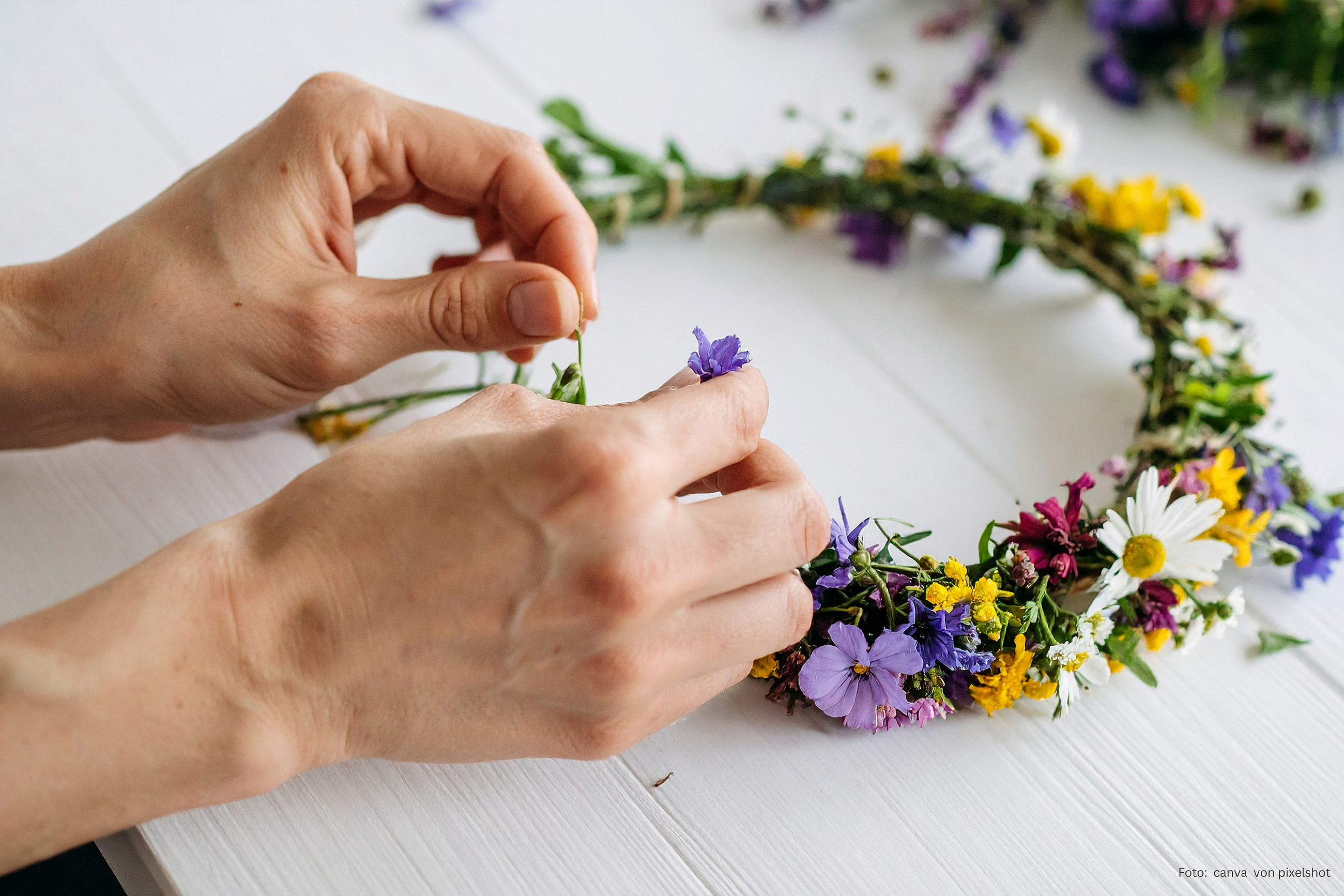 aus Naturmaterialien wie frischen oder getrockneten Blumen und Bändern. Ob schlicht oder verspielt, es entstehen kleine Kunstwerke, die die Frisur zum Blickfang machen.