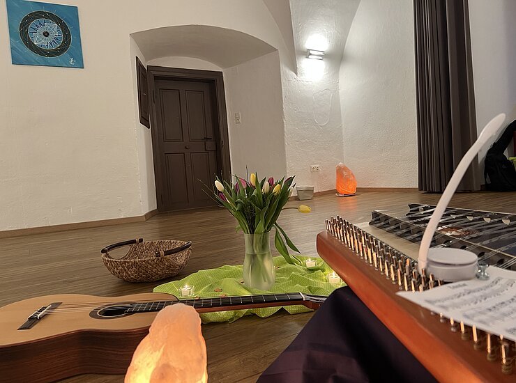 Meditation mit Hackbrett und Gitarre. Du darfst dich in eine Decke einkuscheln und entspannen, während wir dich musikalisch auf den Sommer einstimmen. Meditative Impulse runden unser Angebot ab.
