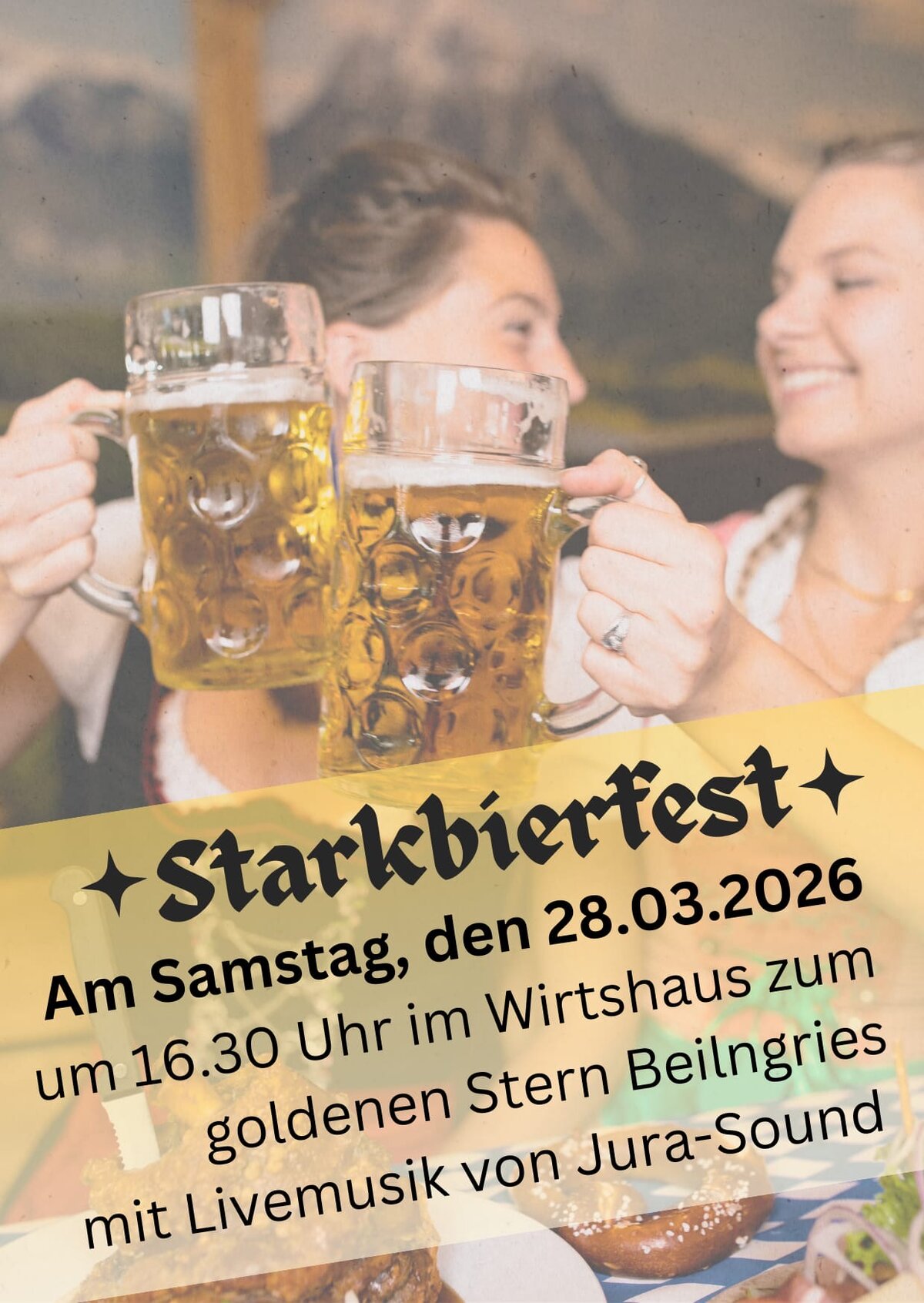 Am Samstag, den 28.03.2026, laden wir euch herzlich zum traditionellen Starkbierfest ins Wirtshaus zum goldenen Stern in Beilngries ein. Los geht’s um 16:30 Uhr – freut euch auf kräftiges Starkbier, zünftige Schmankerl und beste Stimmung in gemütlicher Wirtshausatmosphäre. Für die passende musikalische Unterhaltung sorgt Jura-Sound mit Livemusik und garantiert bester Feierlaune! 🎶 Kommt vorbei und feiert mit uns einen geselligen Nachmittag und Abend – wir freuen uns auf euch!
